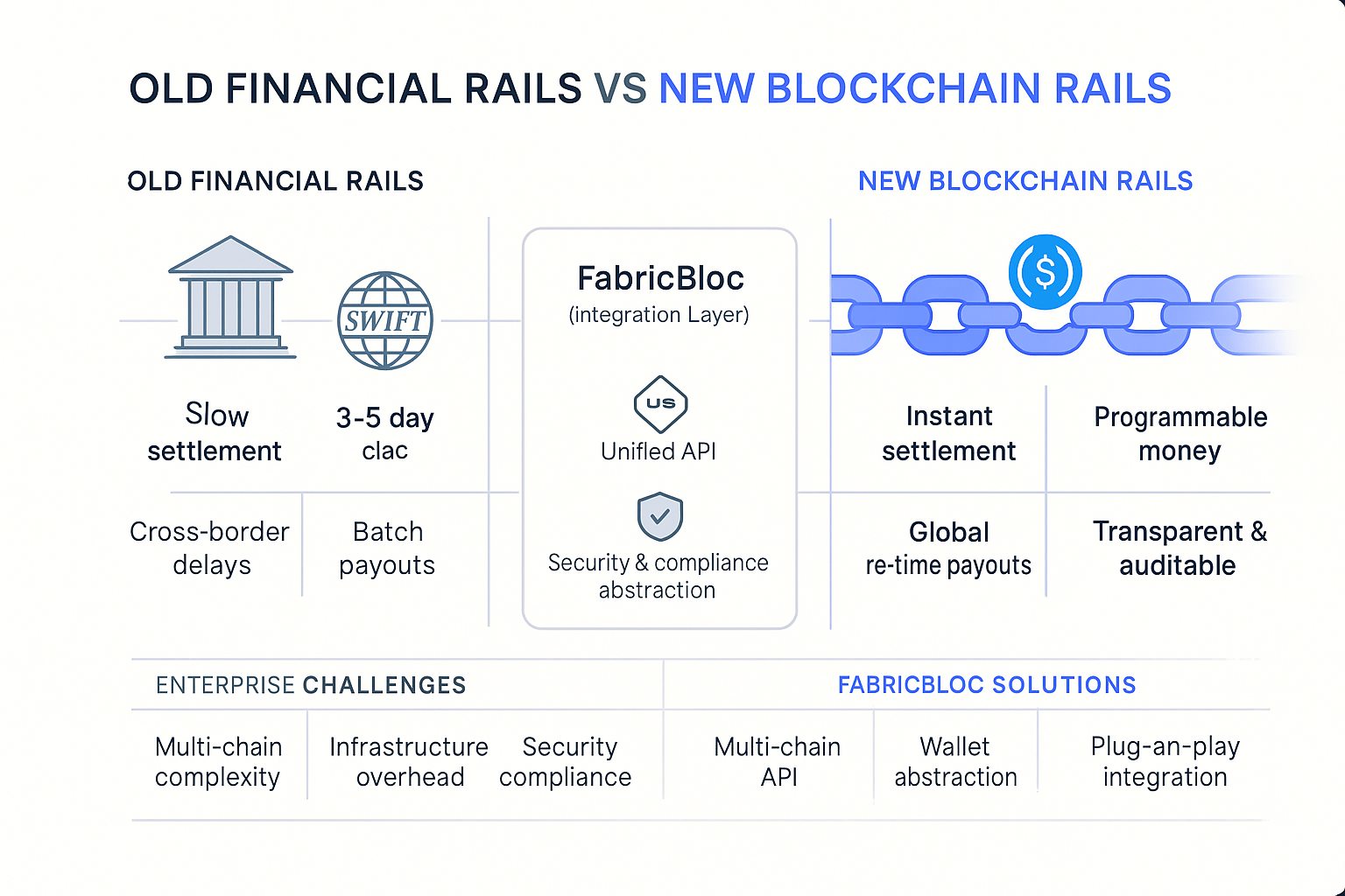 FabricBloc is an enterprise-grade blockchain infrastructure platform that abstracts away the complexity of Web3, enabling organizations to integrate modern payment rails with the reliability and simplicity they expect from traditional systems.